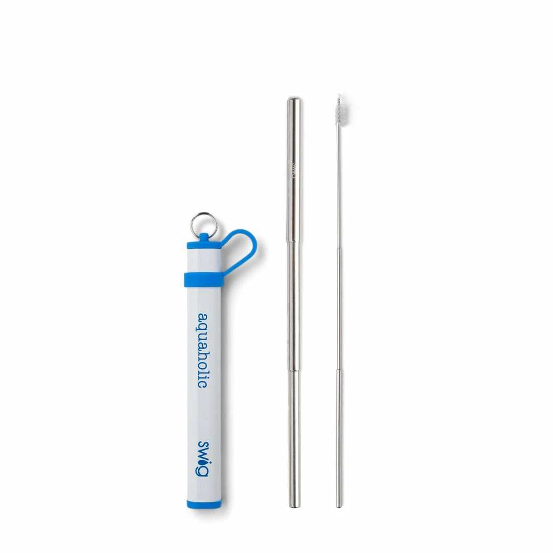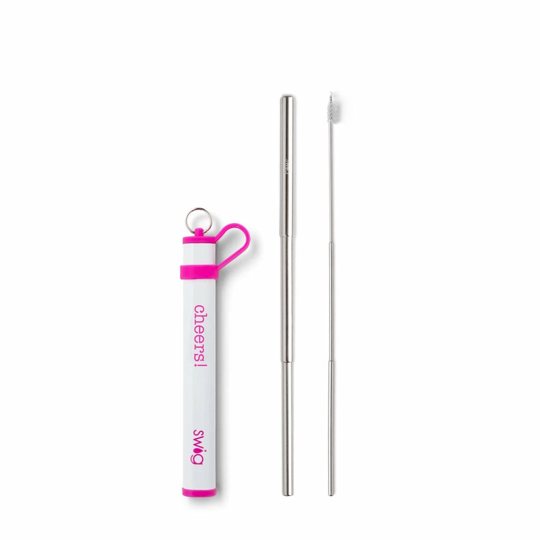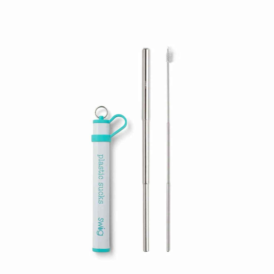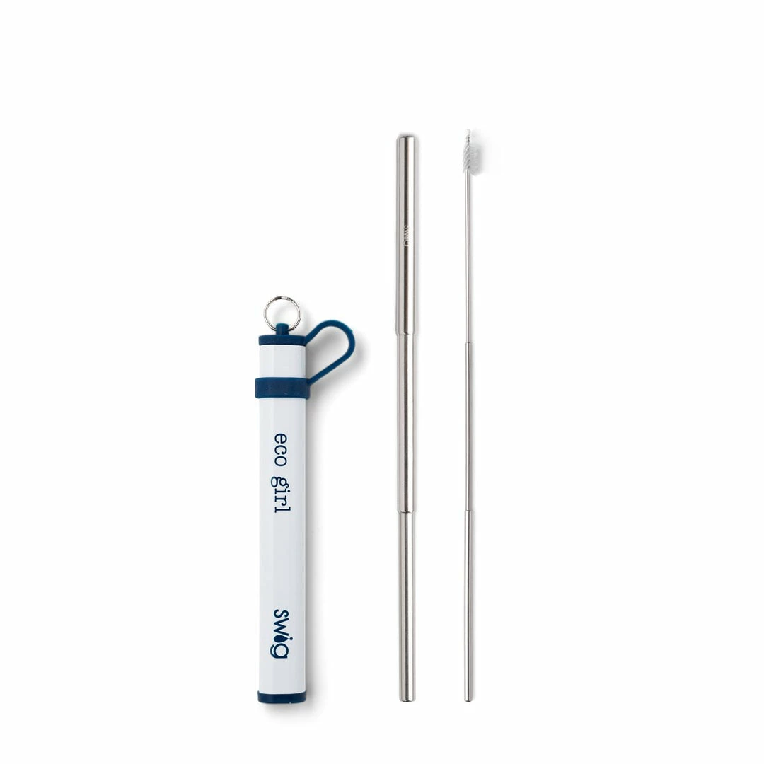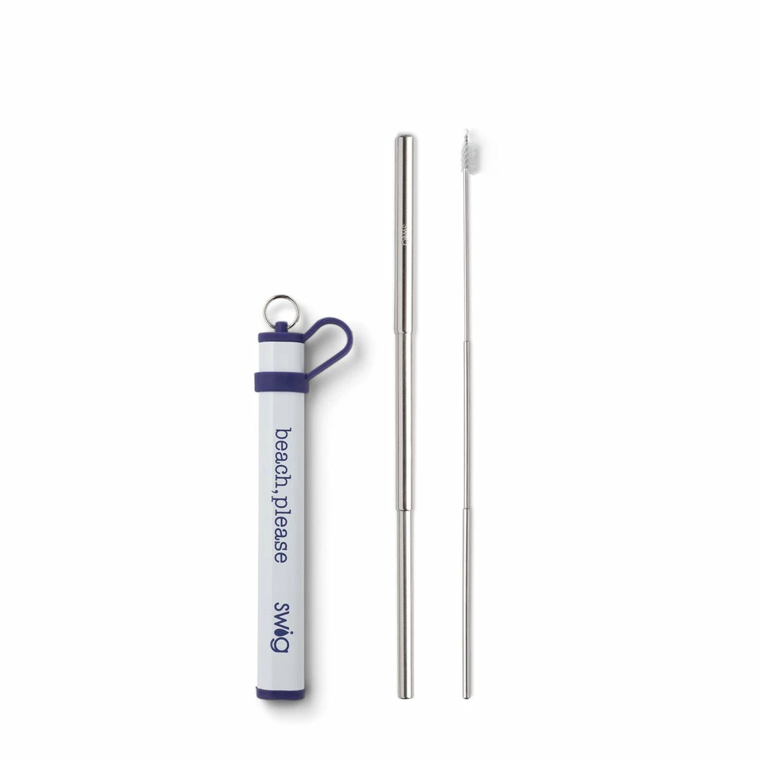 Now you can eliminate the need for those single-use straws and sip from our reusable straws! Thisย two-pieceย straw set includesย one BPA-free, stainless steel telescoping straw and a straw cleaning brush, all packed in a carrying case that is hygienic and handy. They are a perfect fit for our Swig cups or any cup of comparable size you may already own. Recommended for cold and room temperature beverages only.ย Handwashing with the cleaning brush included is recommended for maximum sanitation.ย