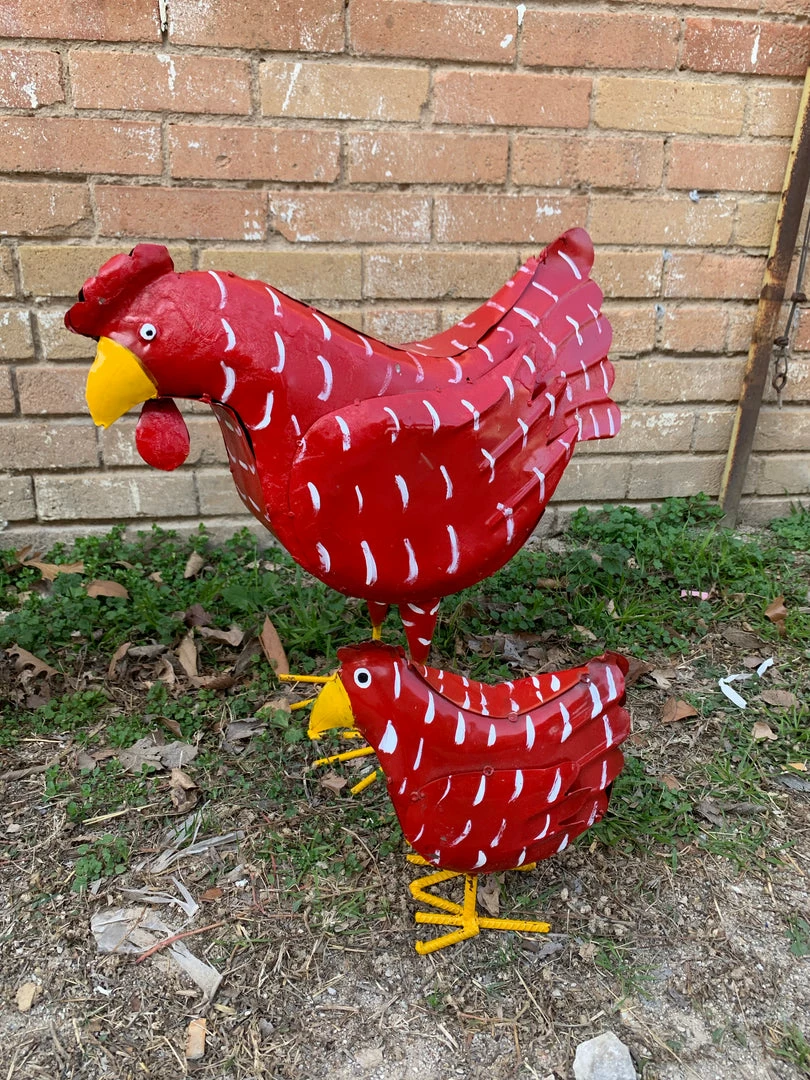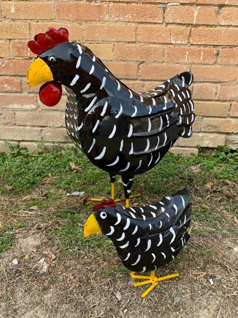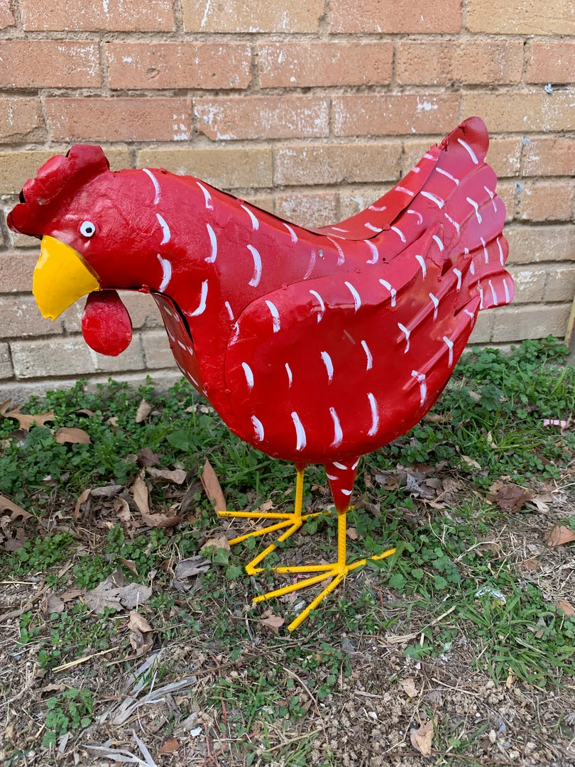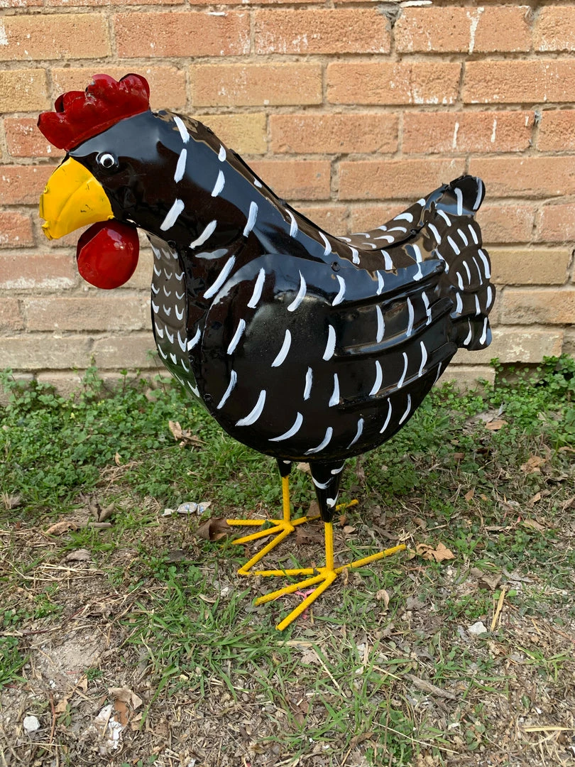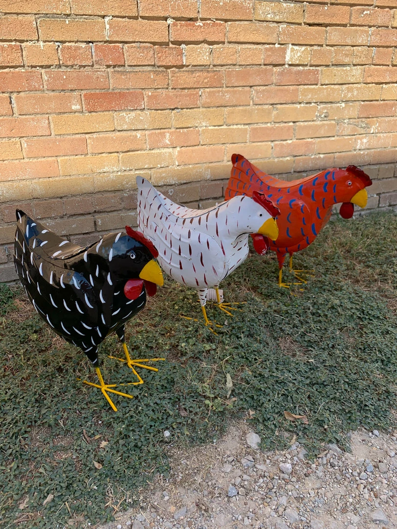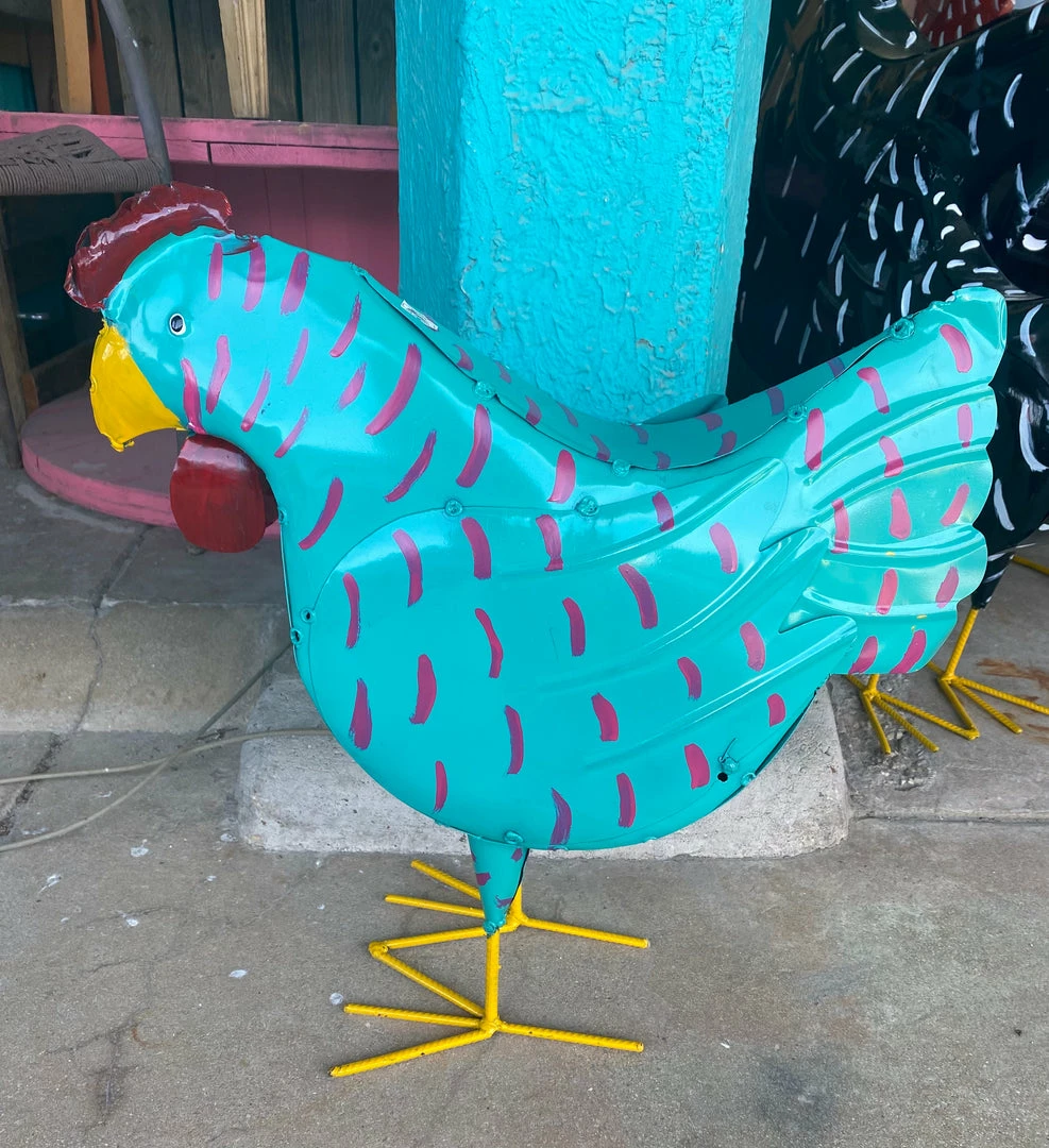 Medium Metal Chicken In 3 colors- all metal with metal feet that stand and can be stakes in yard or sit indoor for art decor. Painted and clear coated.
