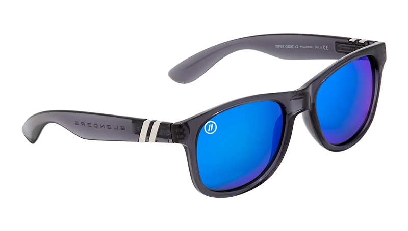 No, theΒ βTipsy Goat x2βΒ isnβt a duo of drunk farm animals but, yes, people will be absolutely intoxicated by your aesthetic when you wear these. They take the advanced progression of quality and durability provided by ourΒ βM Class x2 CollectionβΒ (a polycarbonate frame, laser-etched lenses, metal temple stripes, etc.) and wrap it in a stylish skin of glossy crystal gray thatβs complemented by navy blue and smoke polarized lenses.