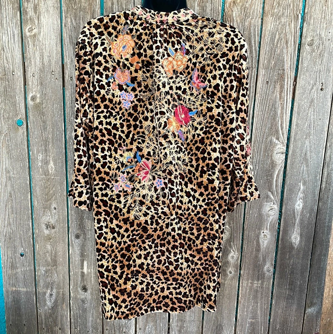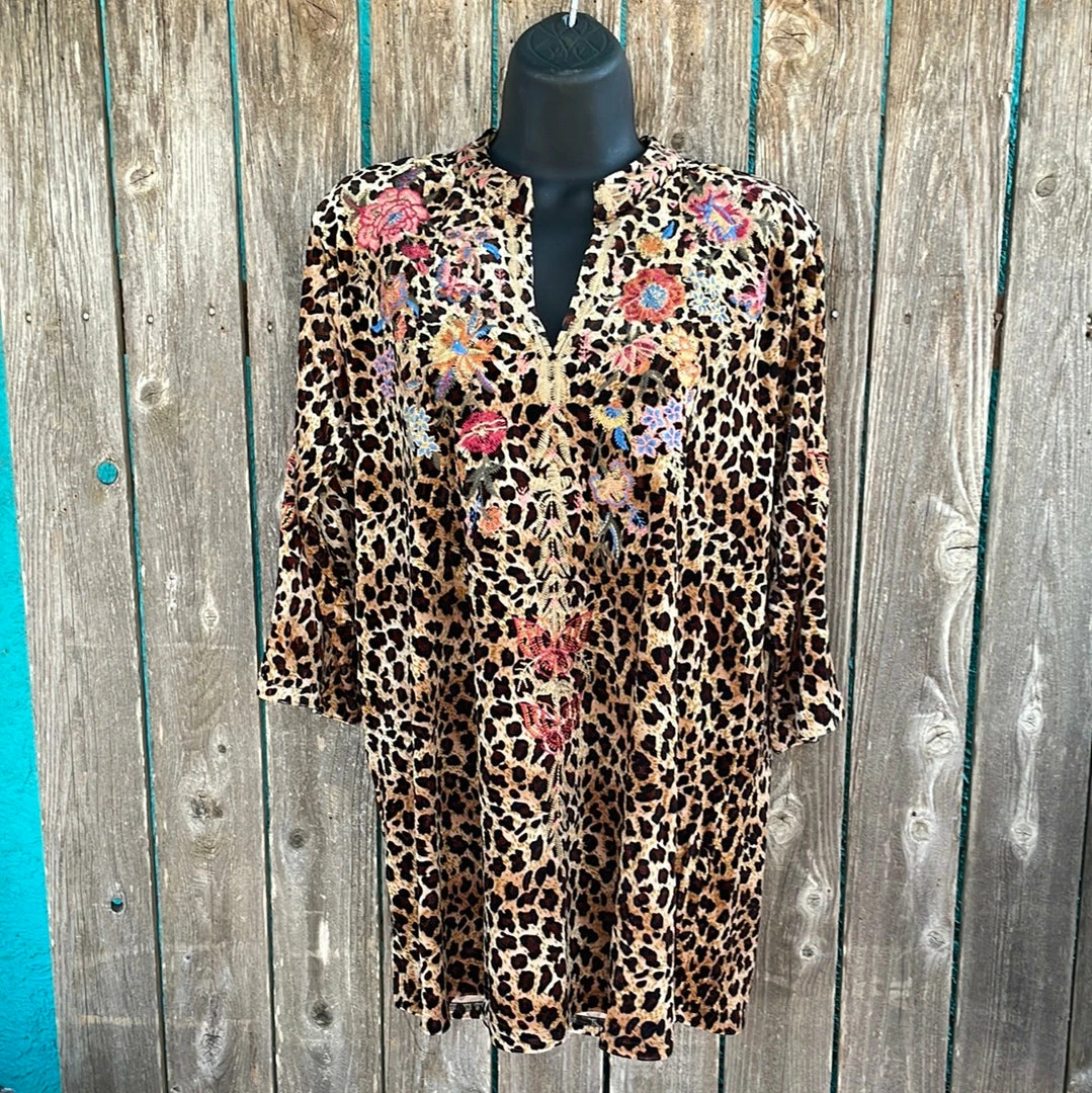 This lovely velvet cheetah tunic has exquisite fall colored embroidery.ย This is a pull over style with a v-notch neck.