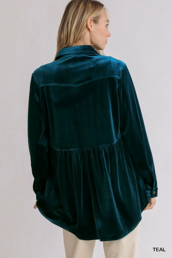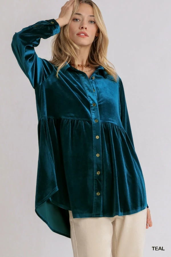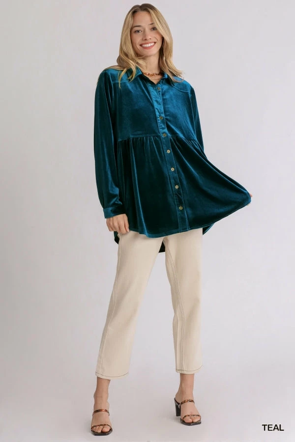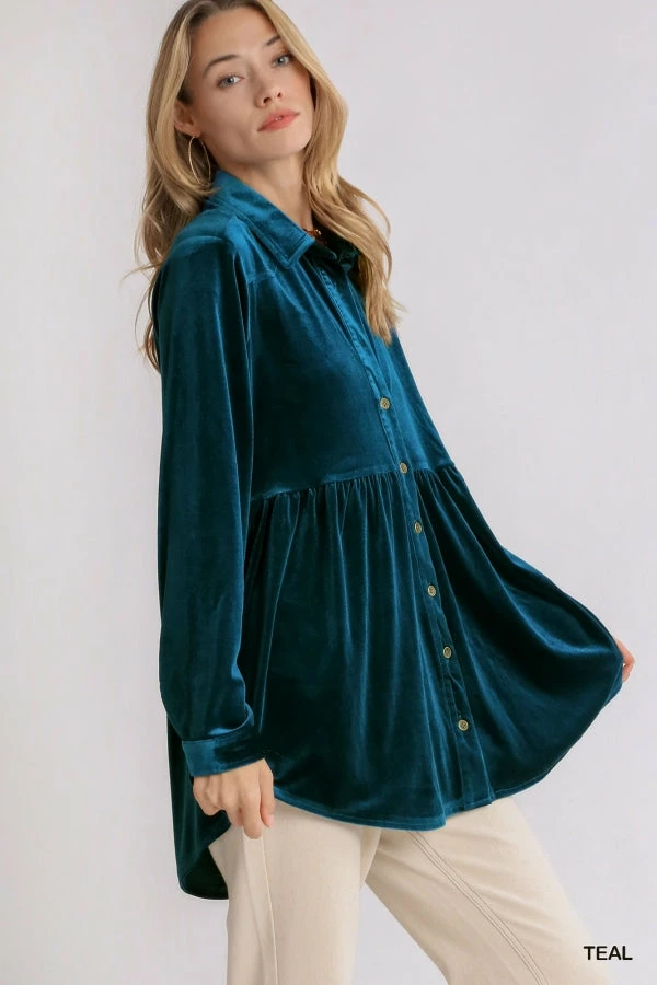 Velvet Collar Button Down Long Sleeve Tunic Dress with High Low Hem by Umgee.