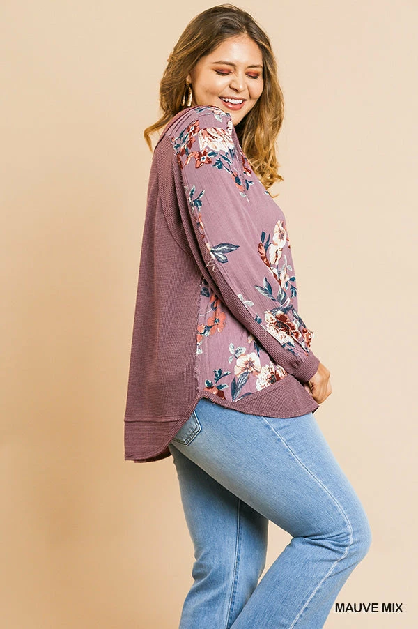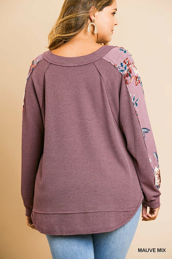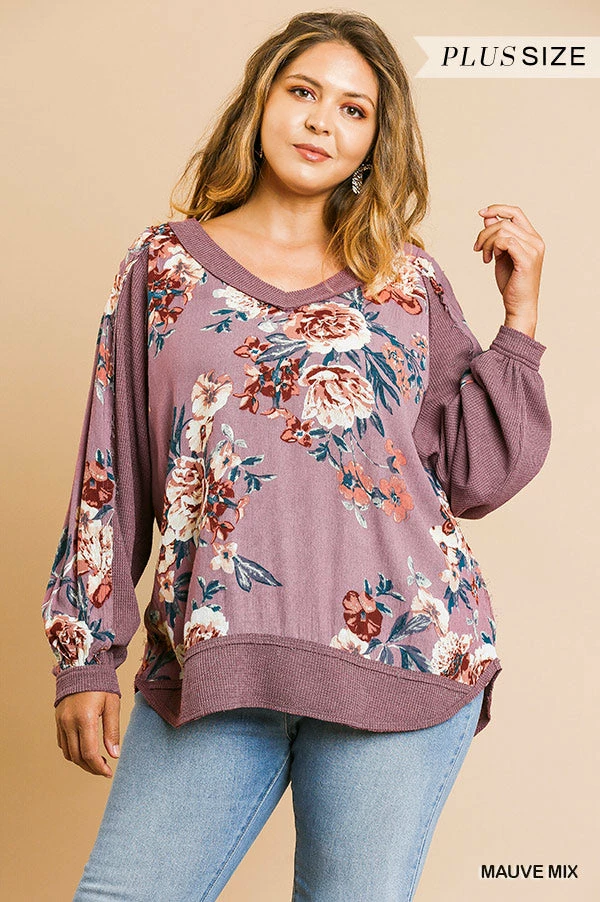 Waffle and Floral Print in a Mauve Mix.Β Β Long Puff Sleeve V-Neck Top with Scoop Hem.