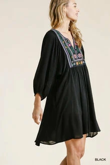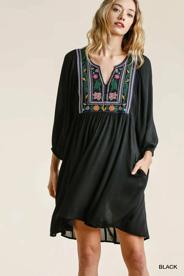 Floral Embroidered Button Front Babydoll Dress with Pockets and High Low Hem (No Lining)