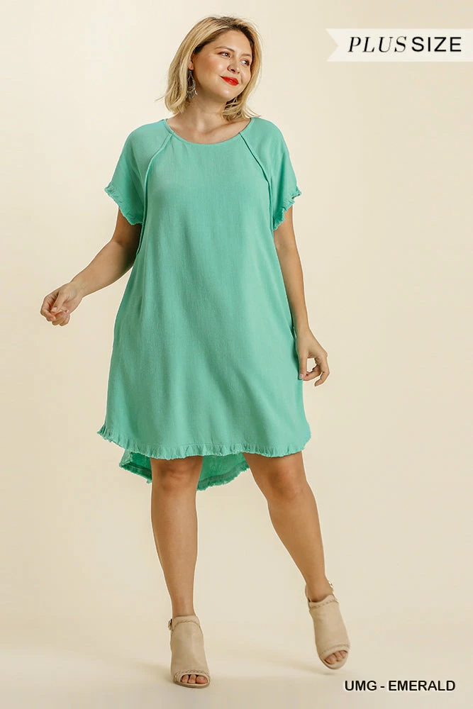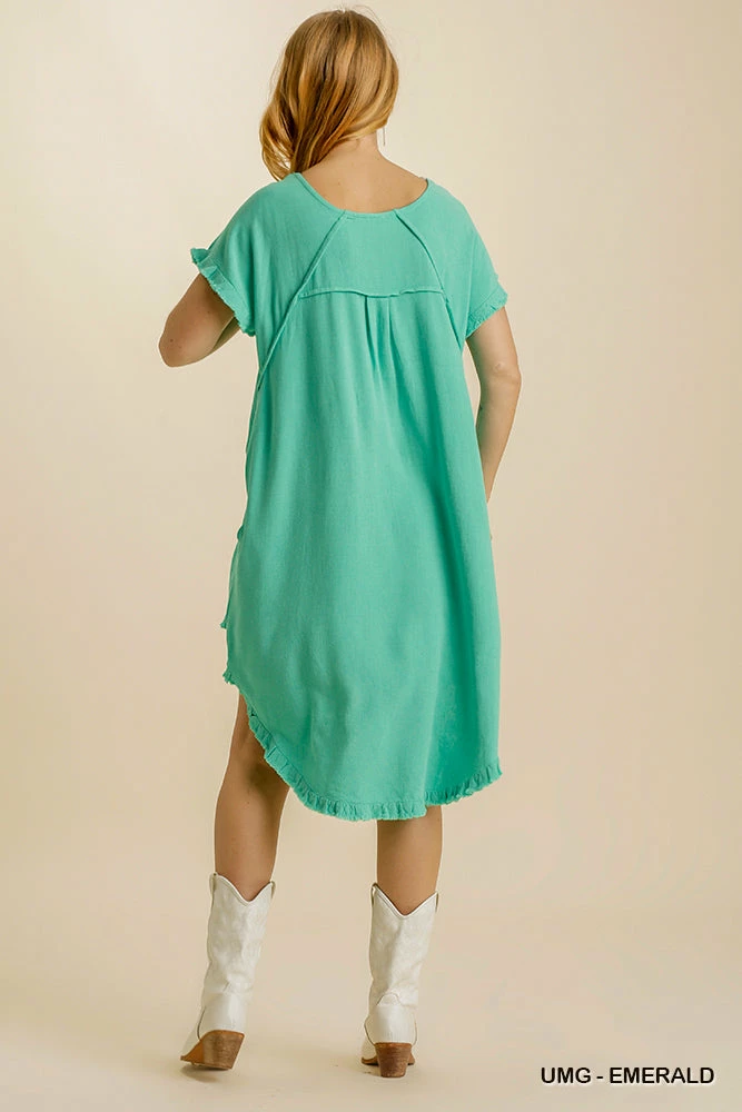 Emerald Linen Blend Round Neck Pocket Dress with Fringe Short Sleeves and a High Low Scoop Hem