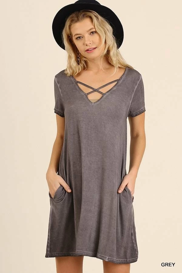 Outlet ⭐ Umgee Washed Crossed V-Neck Pocket 👗 Dress 🥰
