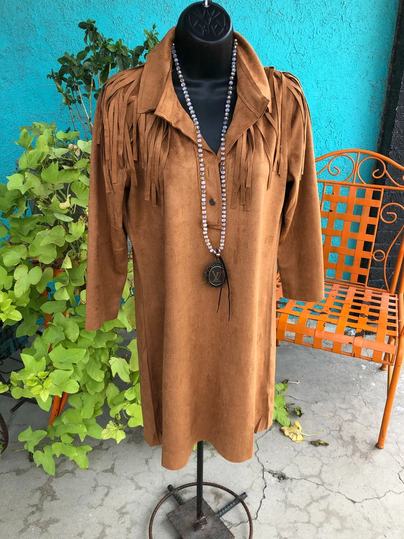 The faux Suede Fringe Dress with unfinished hem and cuffs.ย This dress by WAY is a perfect compliment to your Fall wardrobe.